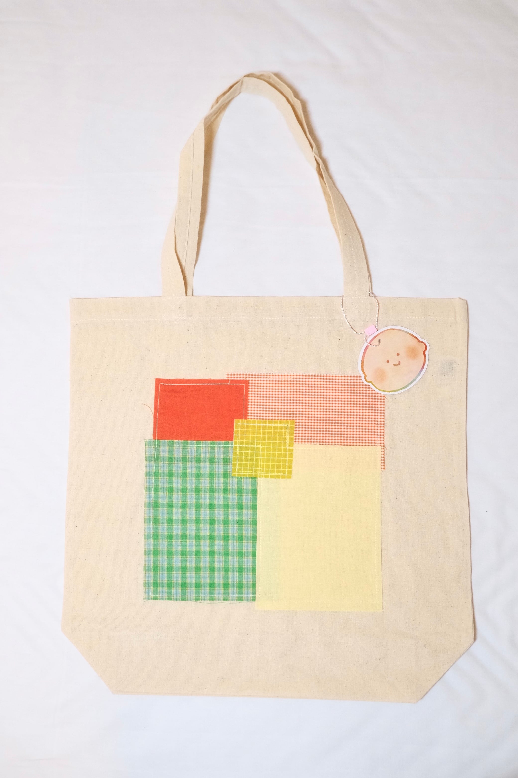 moëのこれまでの作品を思い出させる生地をつなぎ合わせてデザインしたトートバッグに