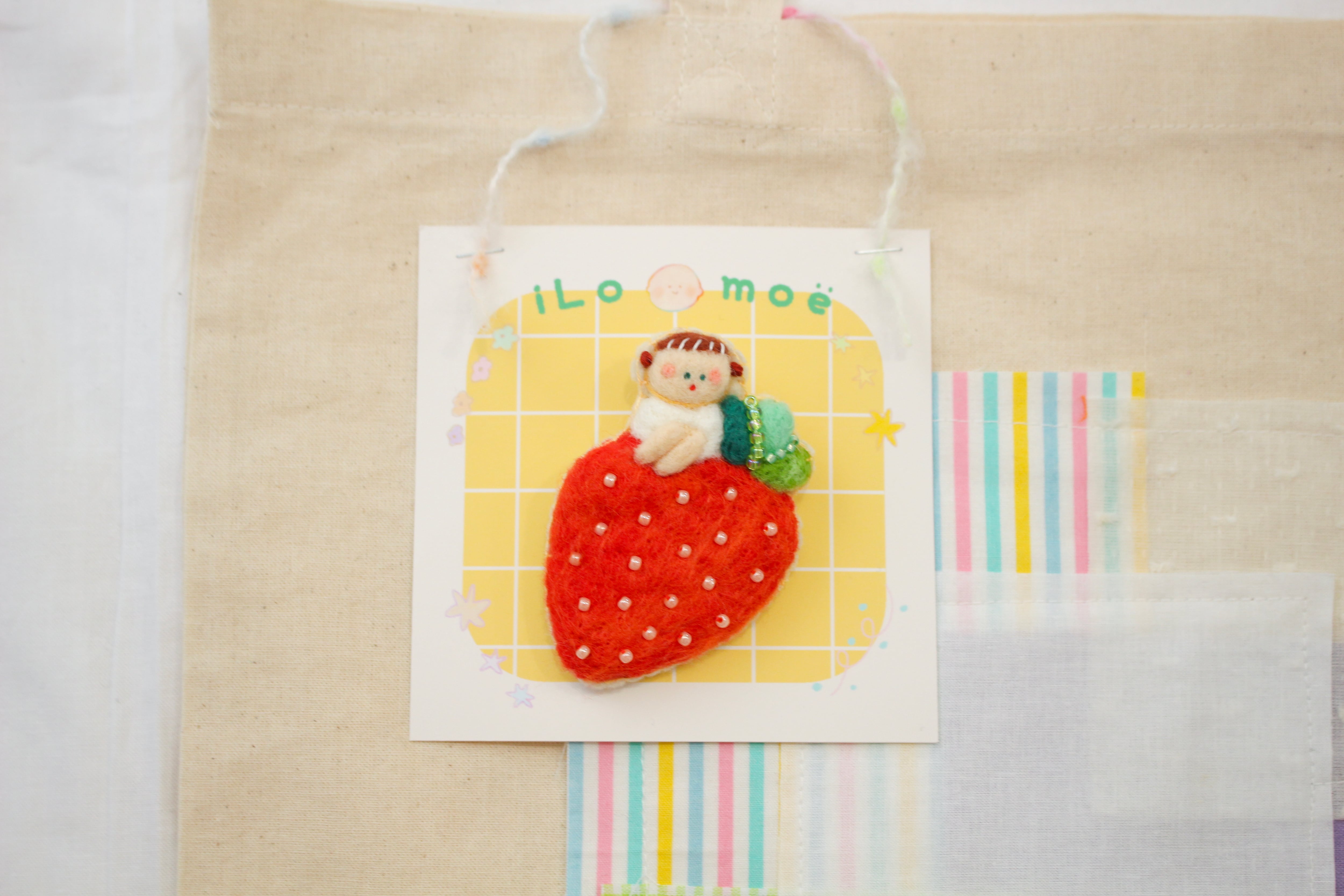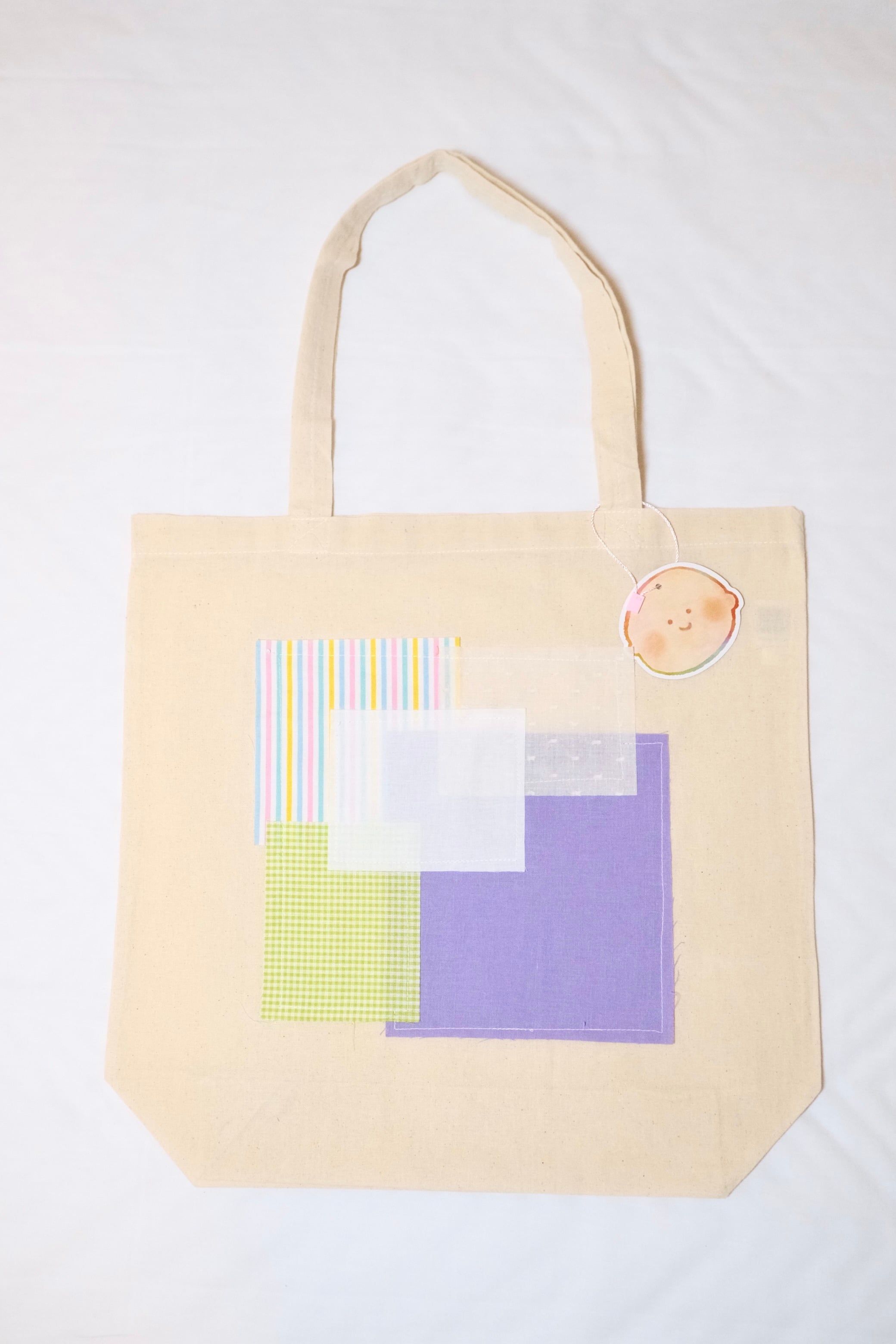 moëのこれまでの作品を思い出させる生地をつなぎ合わせてデザインしたトートバッグに