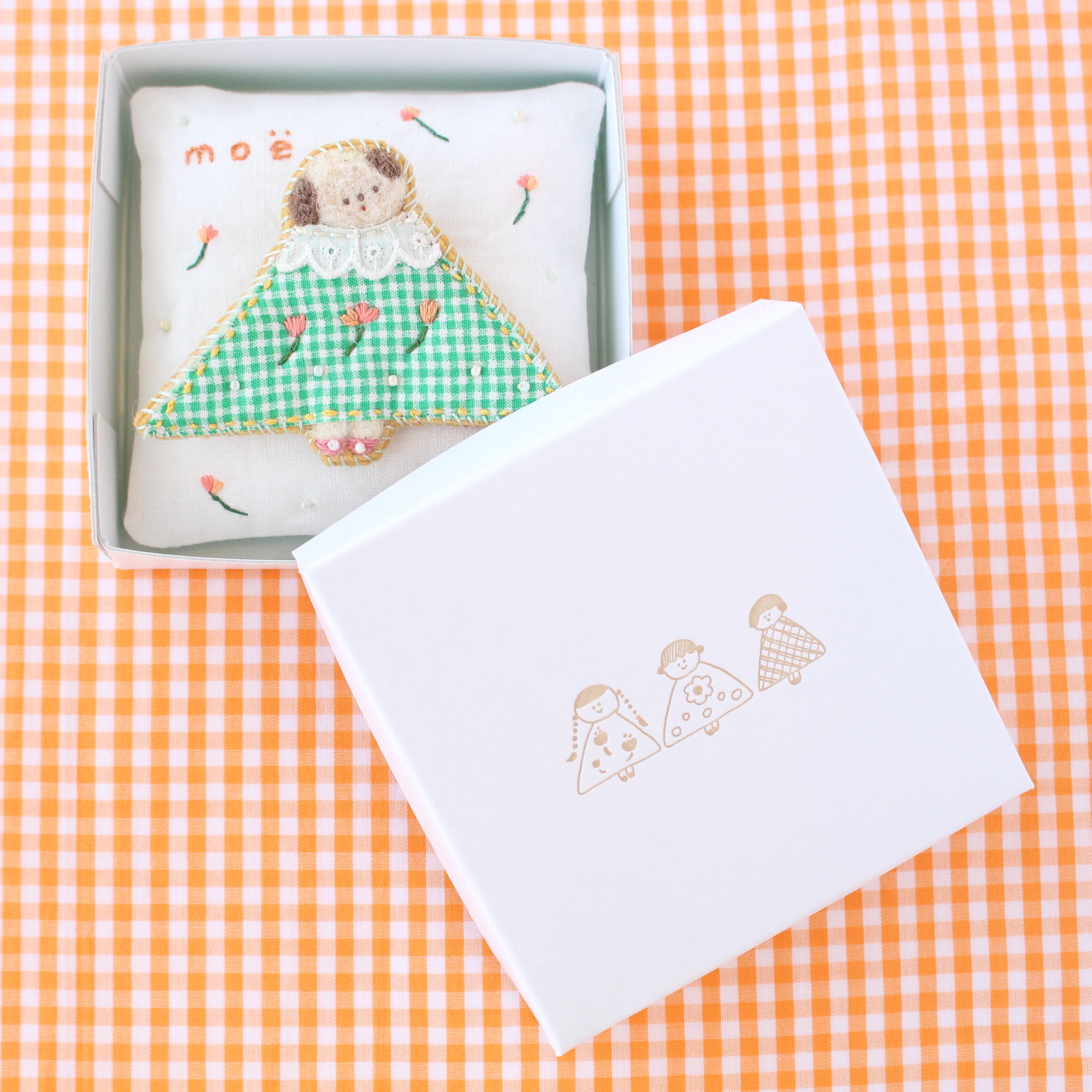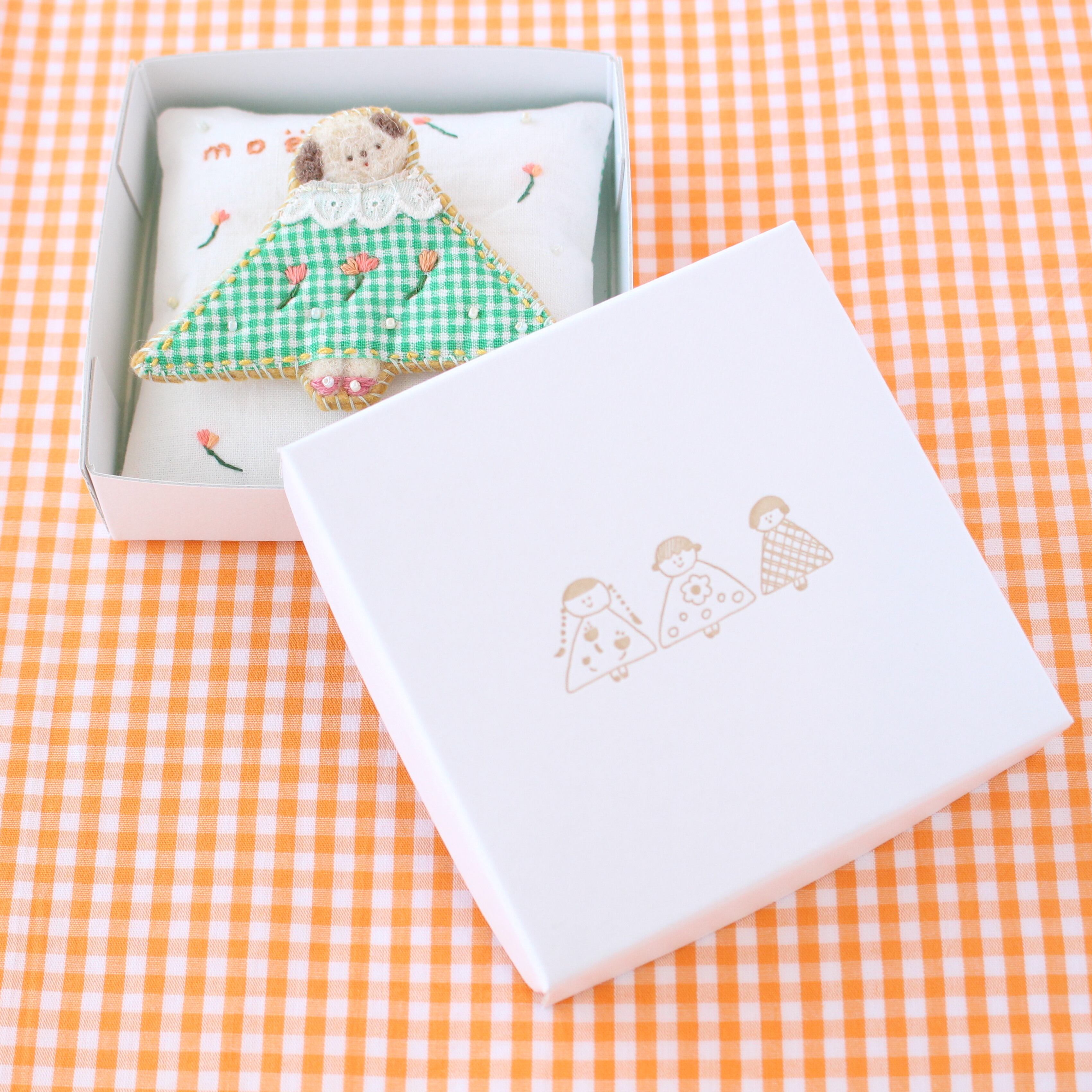 みどりのチェックとオレンジのお花の刺繍のワンピースちゃん。