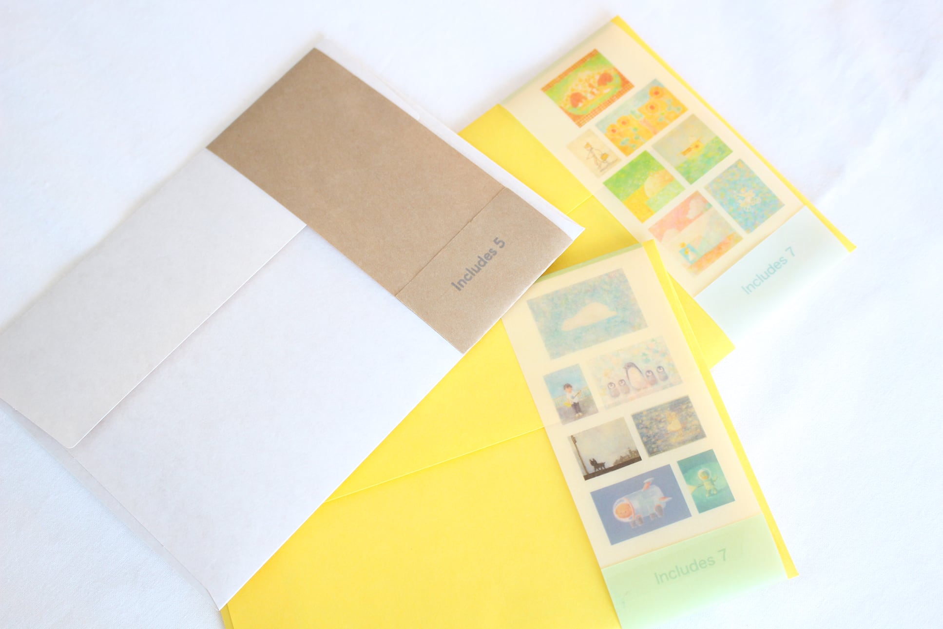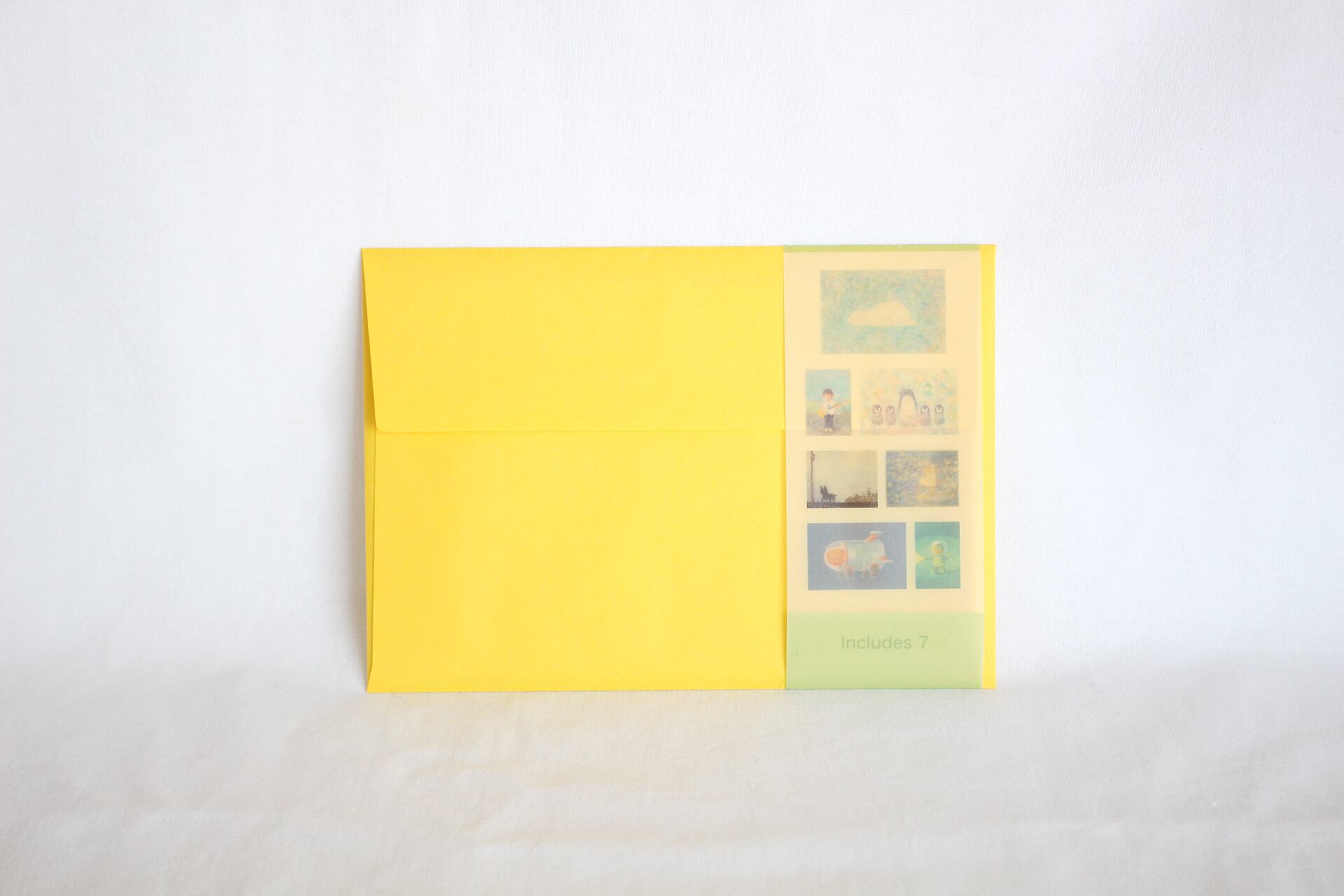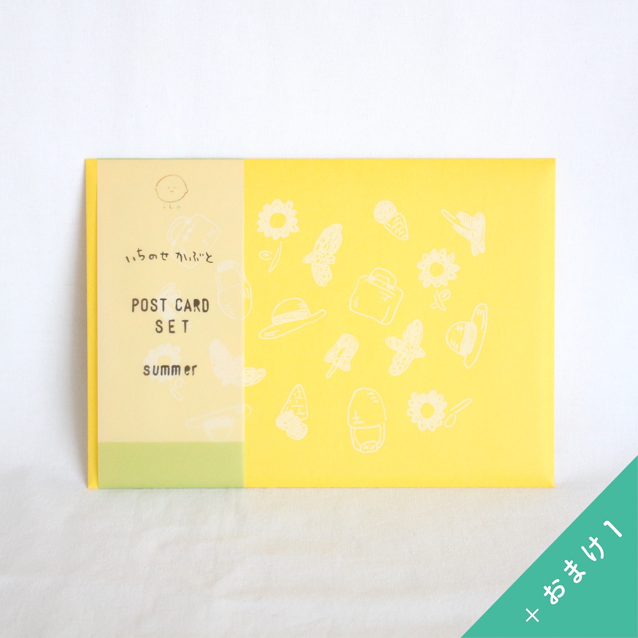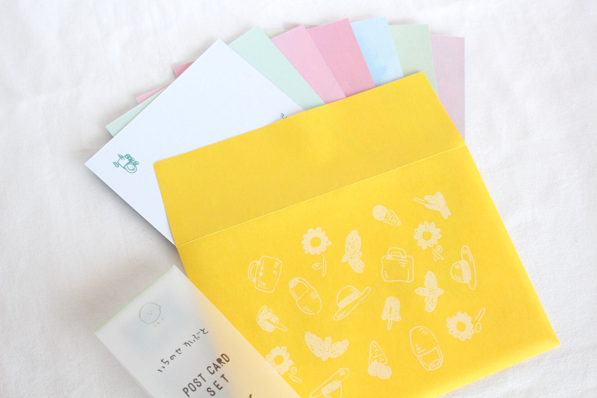 すずしい色合いのポストカードを、特製の夏封筒に入れてセットにしています。