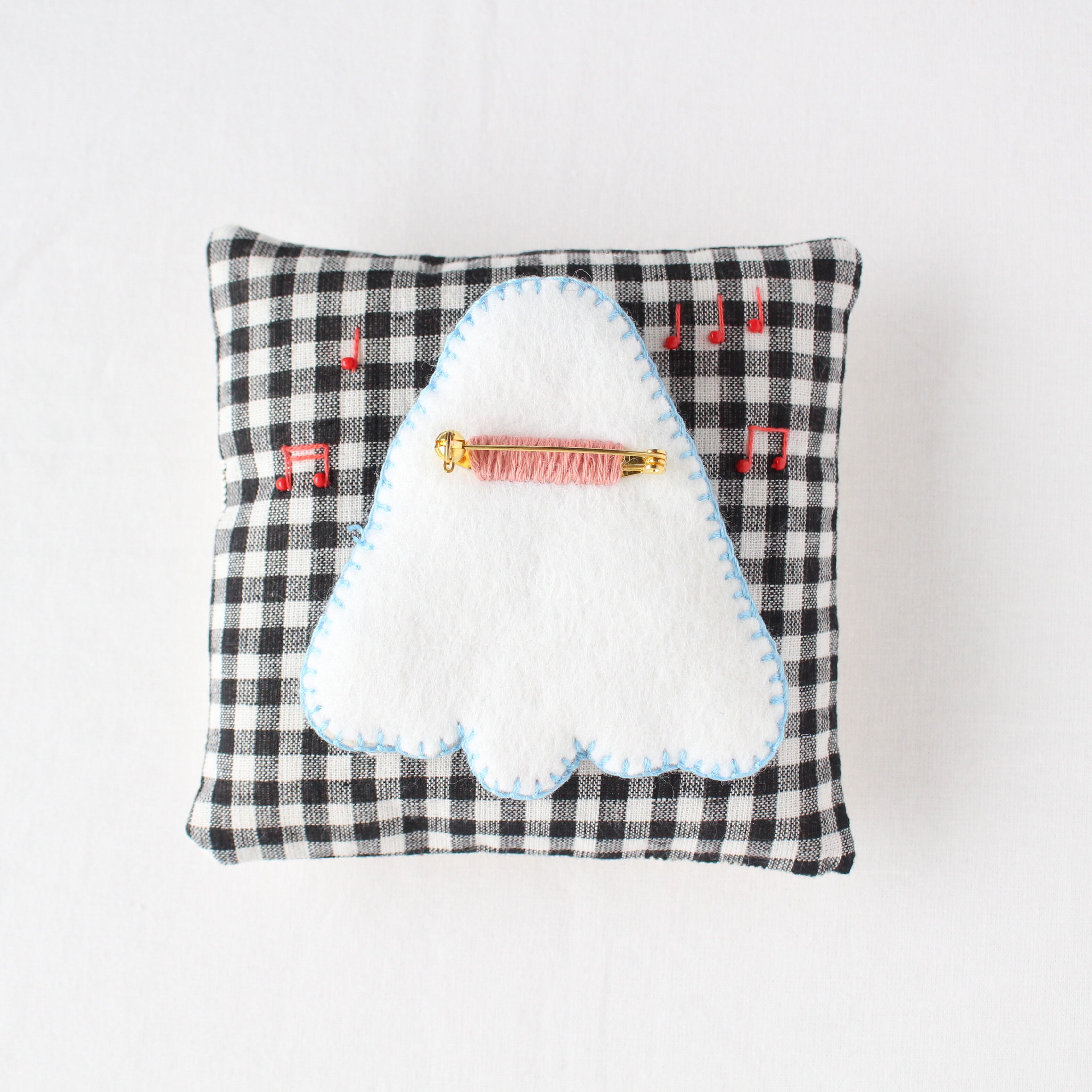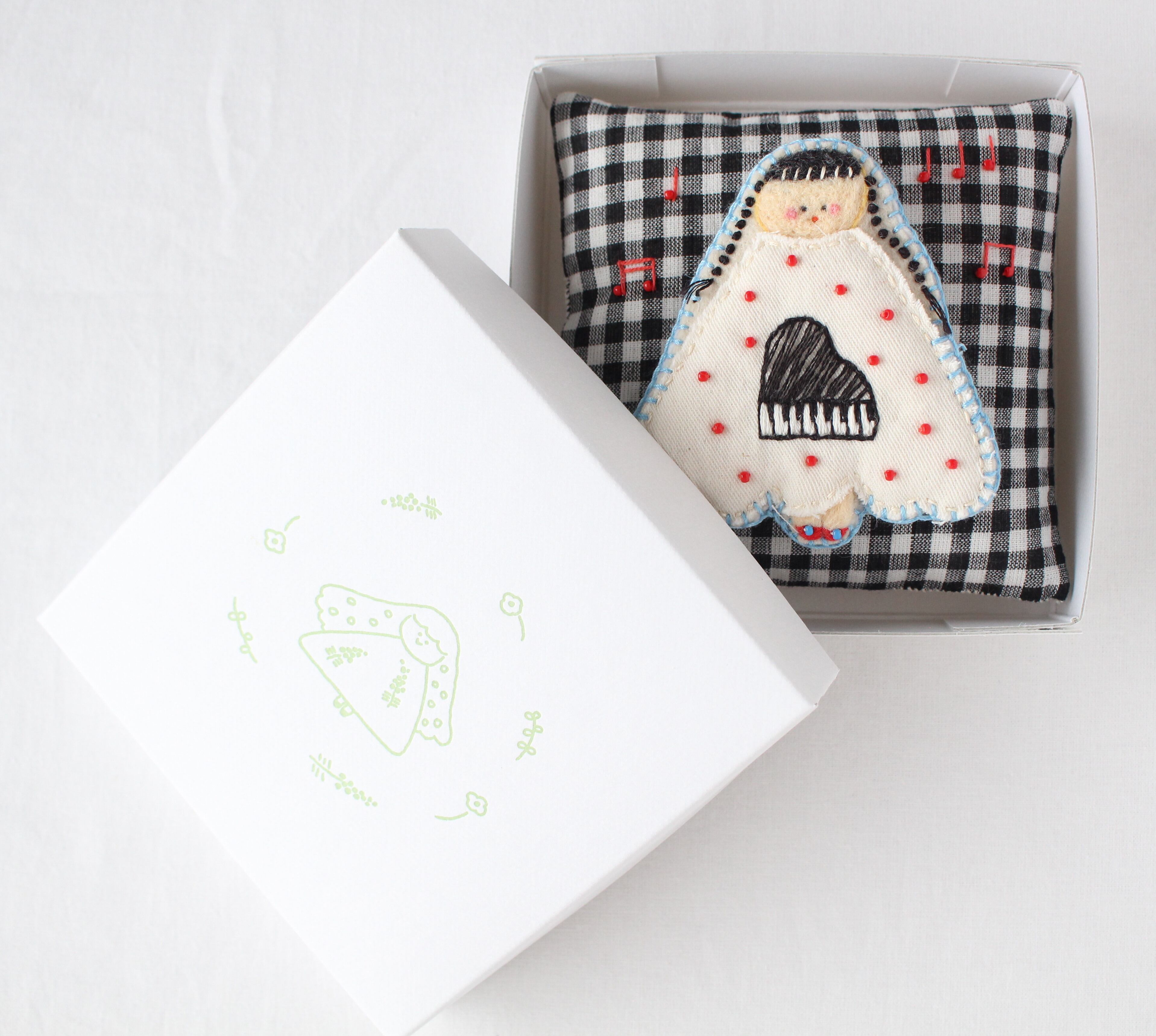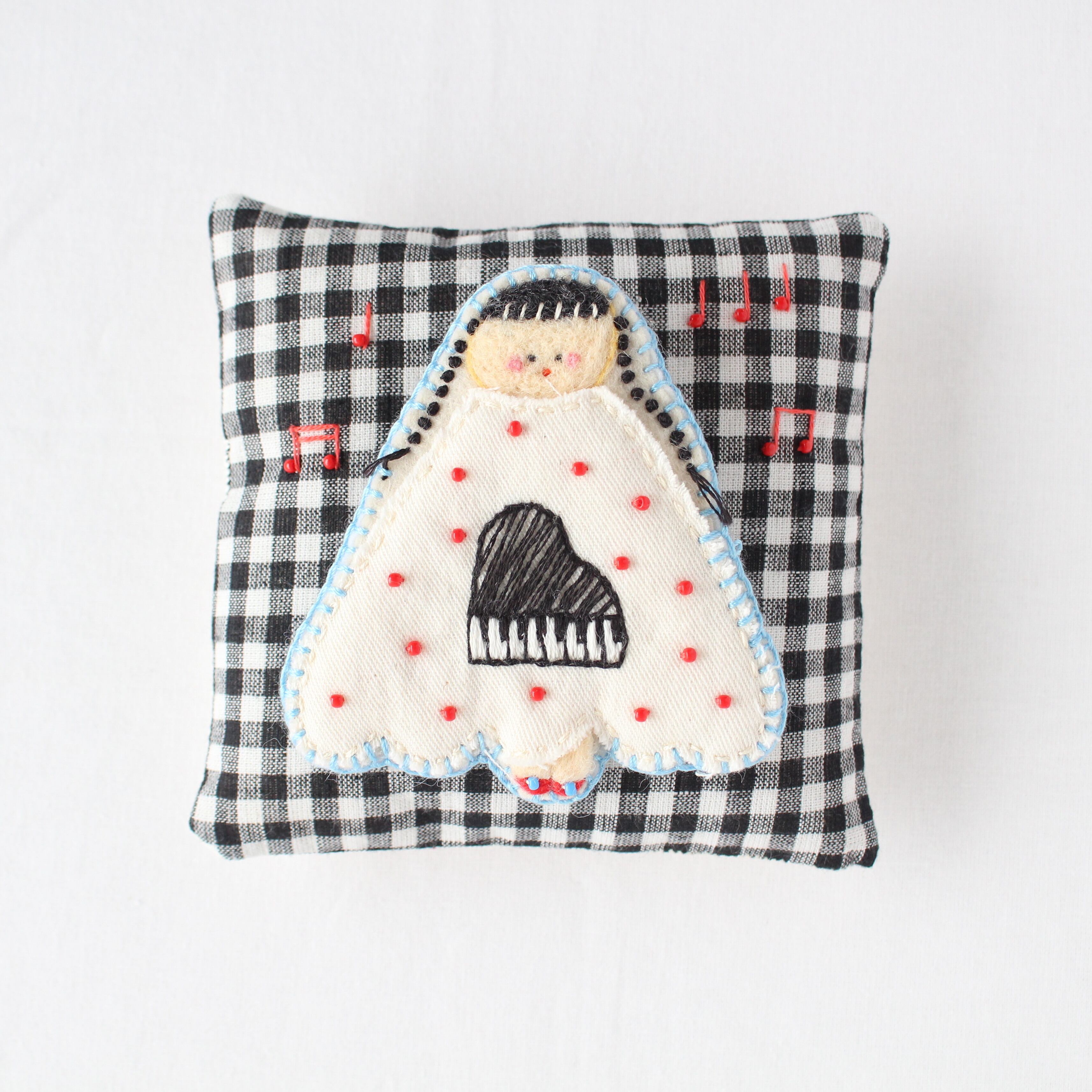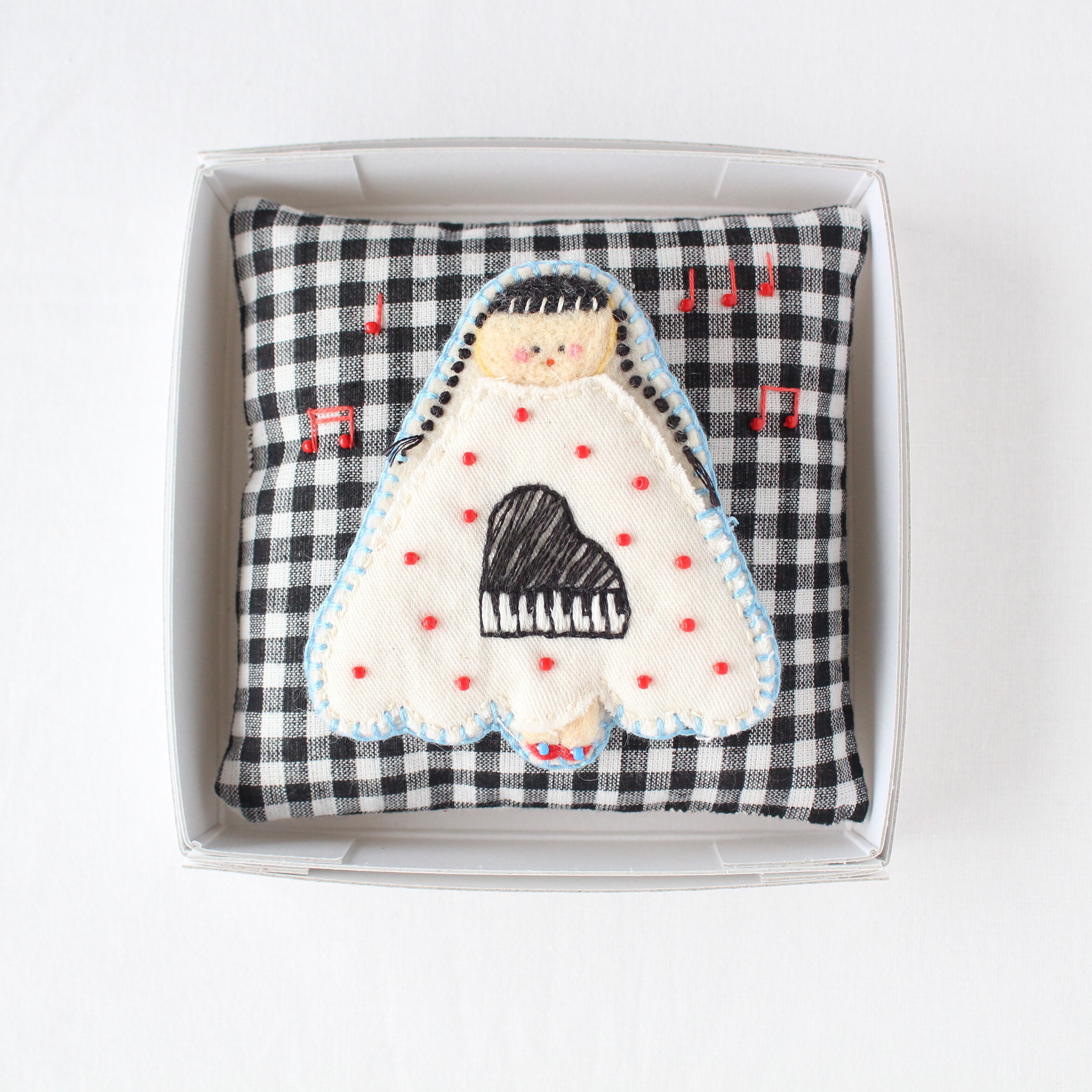 赤いドットとピアノの刺繍のワンピースちゃんbroochです。