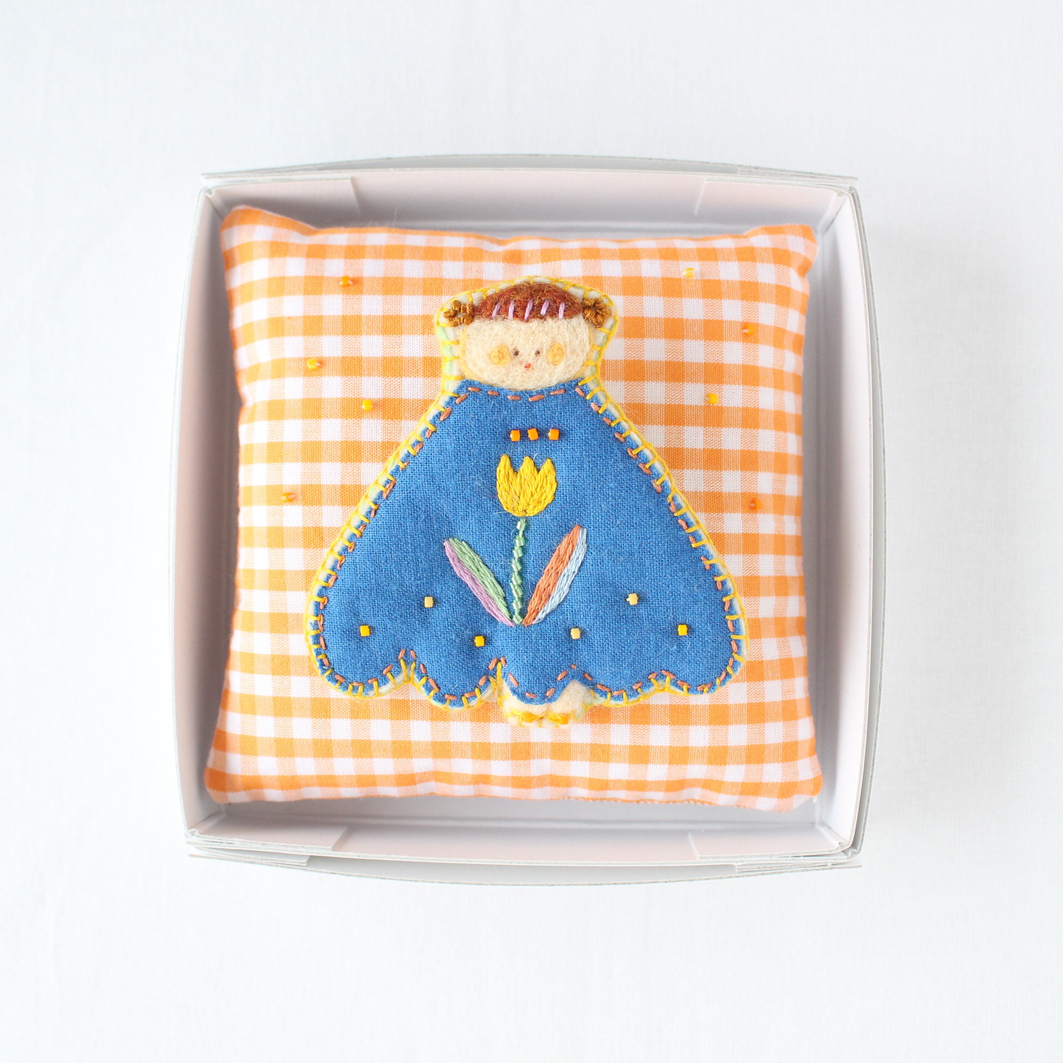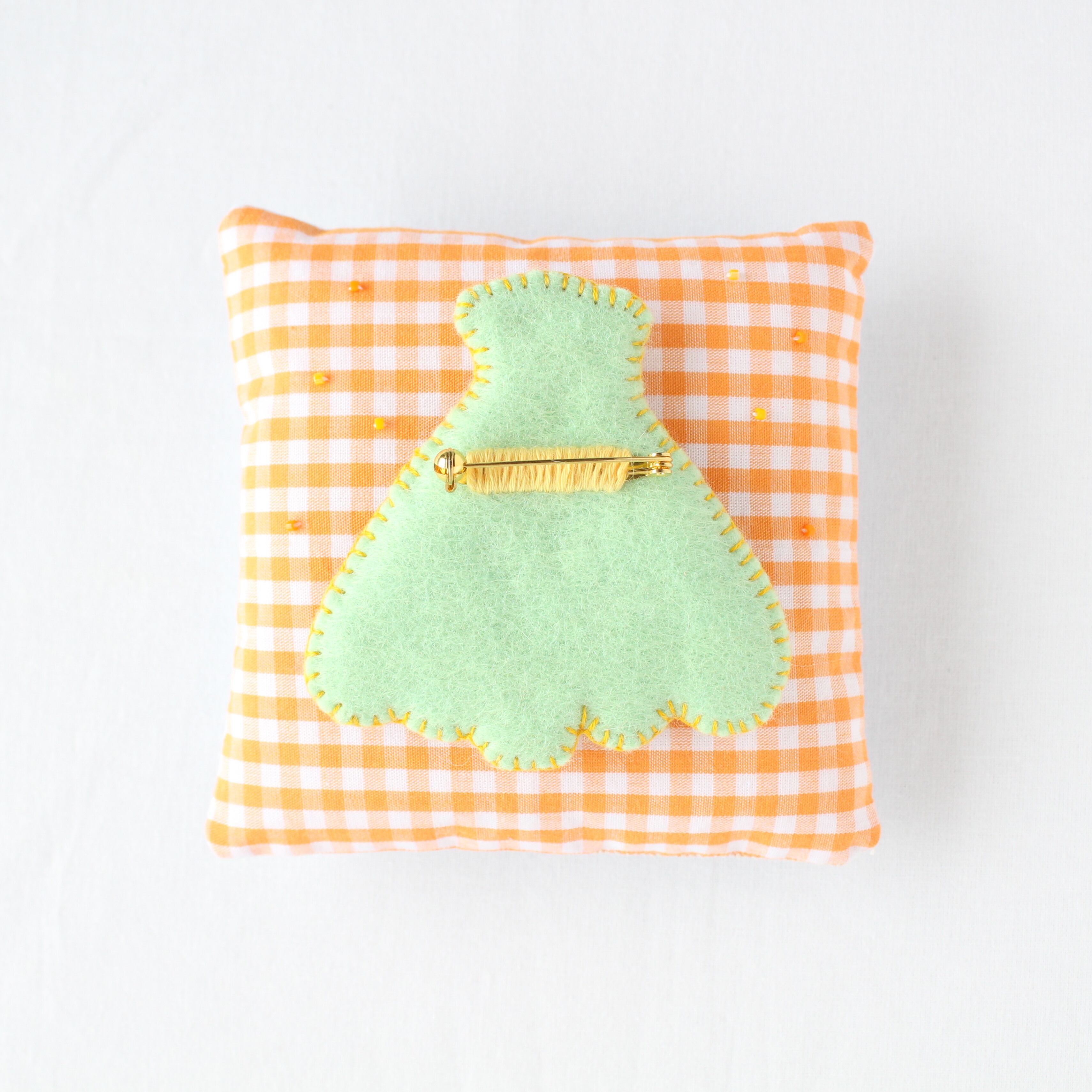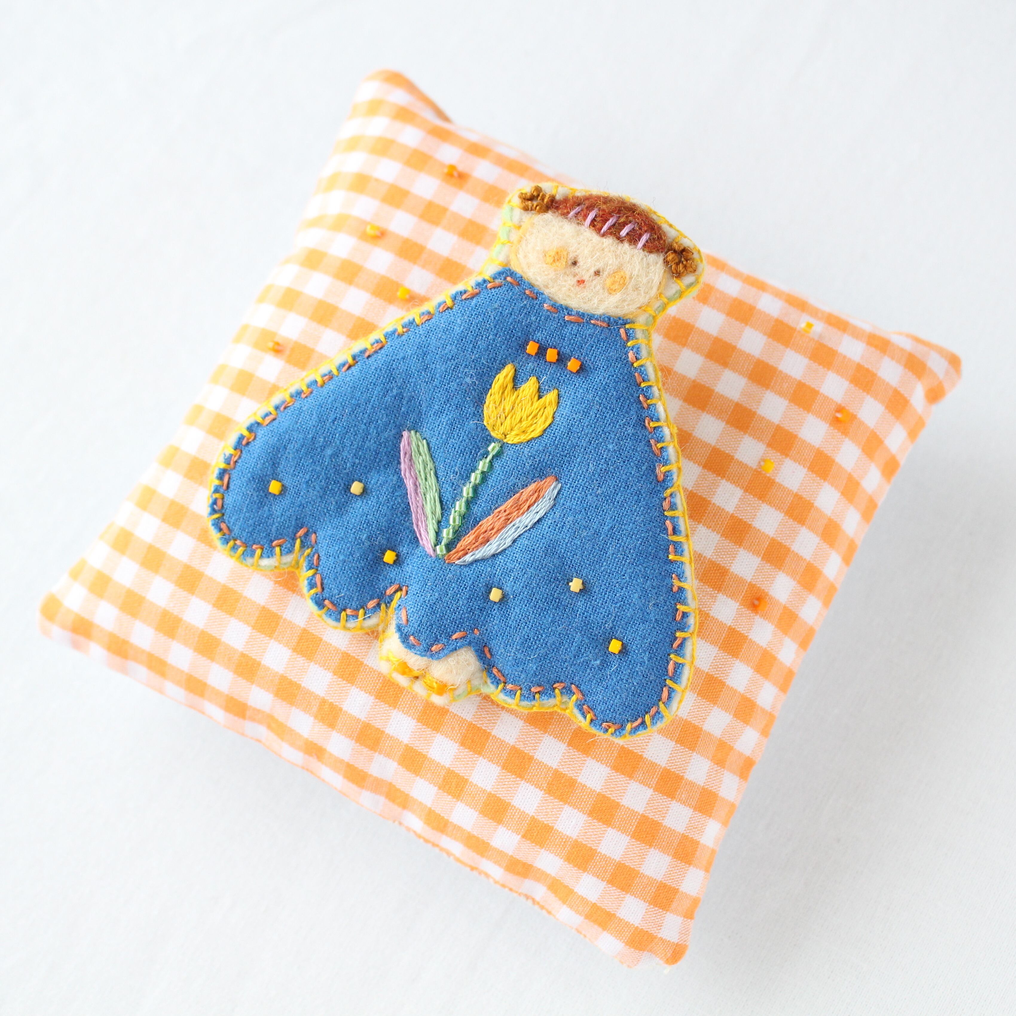 きいろの大きなチューリップの刺繍のワンピースちゃんbroochです。