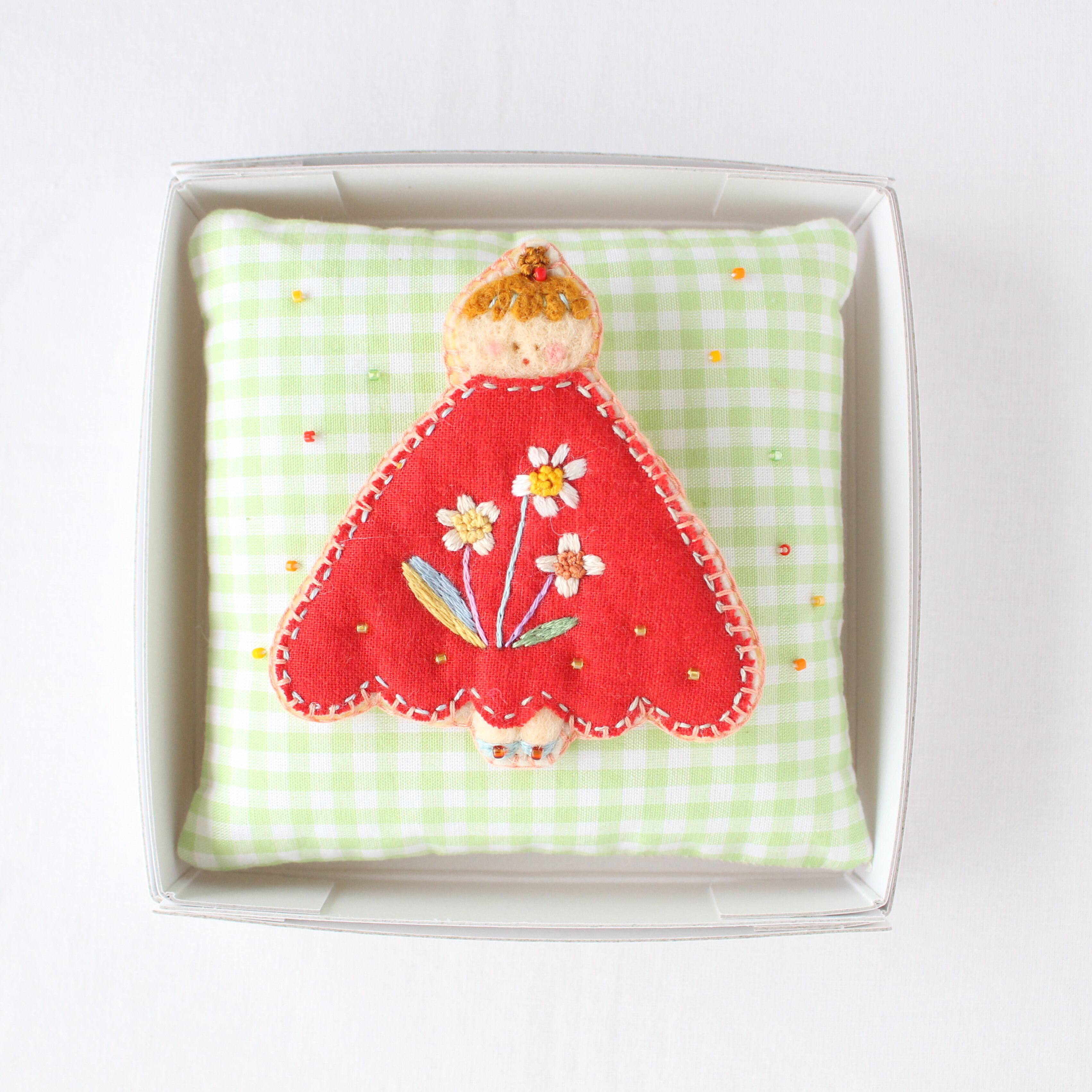 お花の刺繍と赤いワンピースちゃんのbroochです。