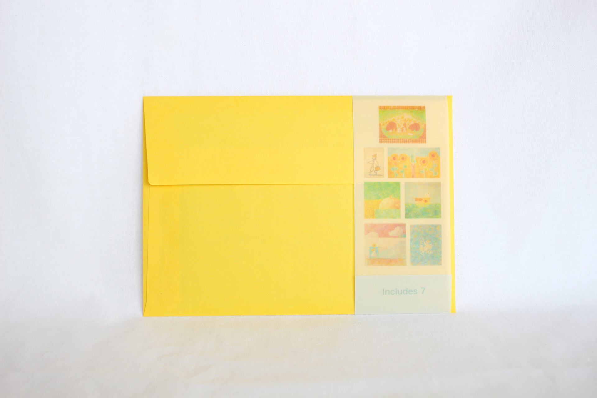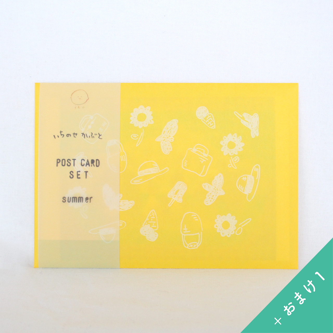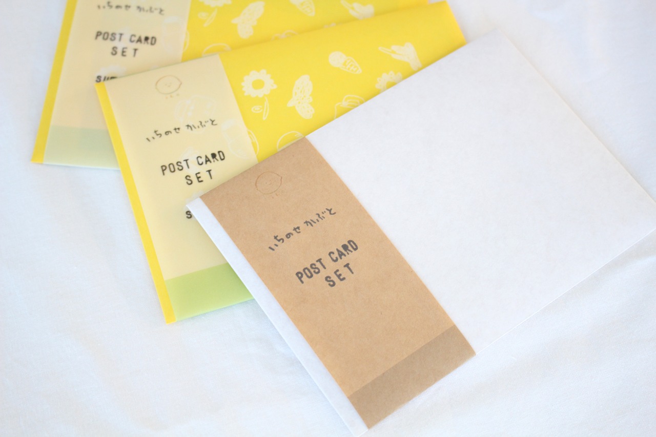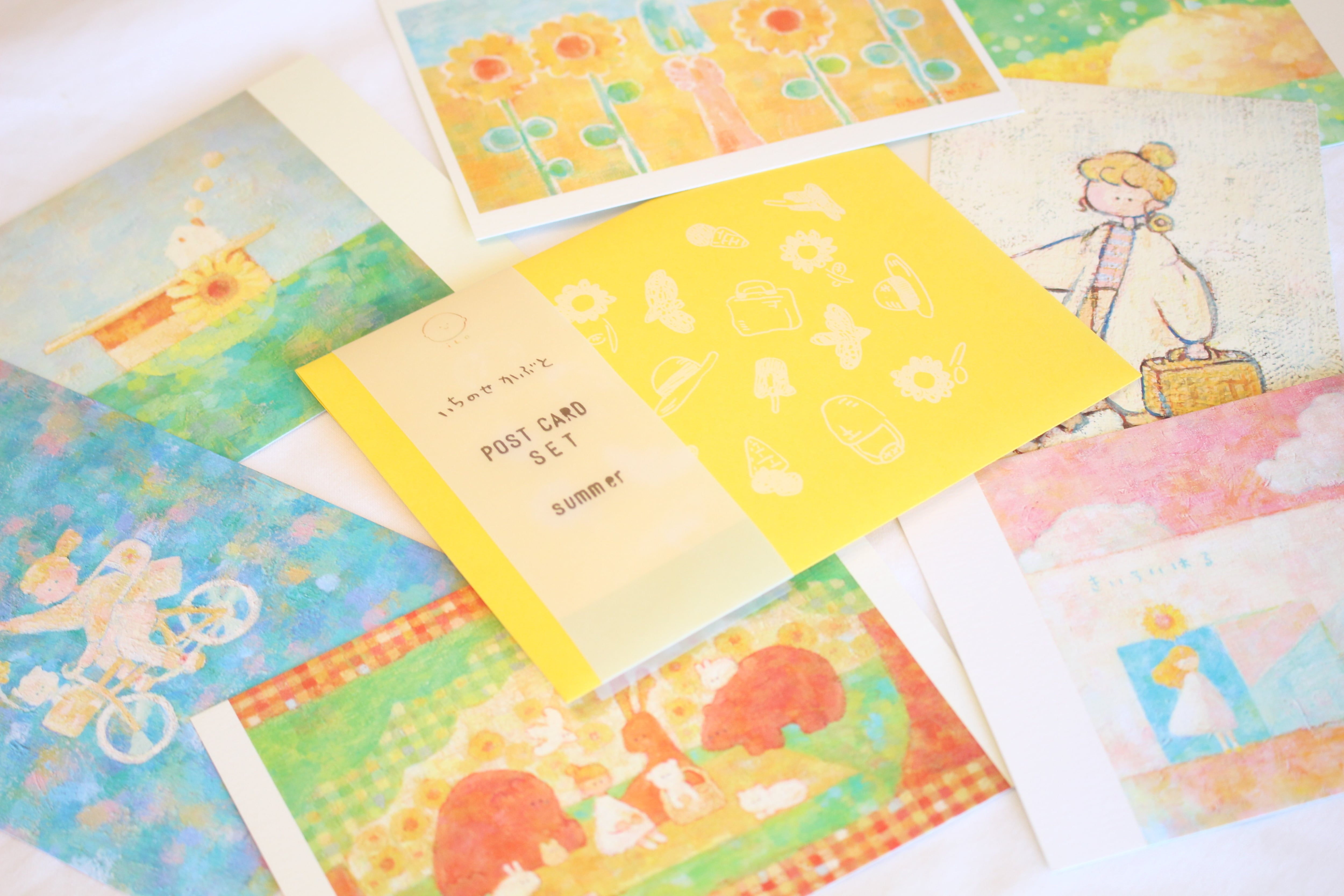 ポストカード裏の切手部分の図案を使用した特製の夏封筒に入れてセットにしました。