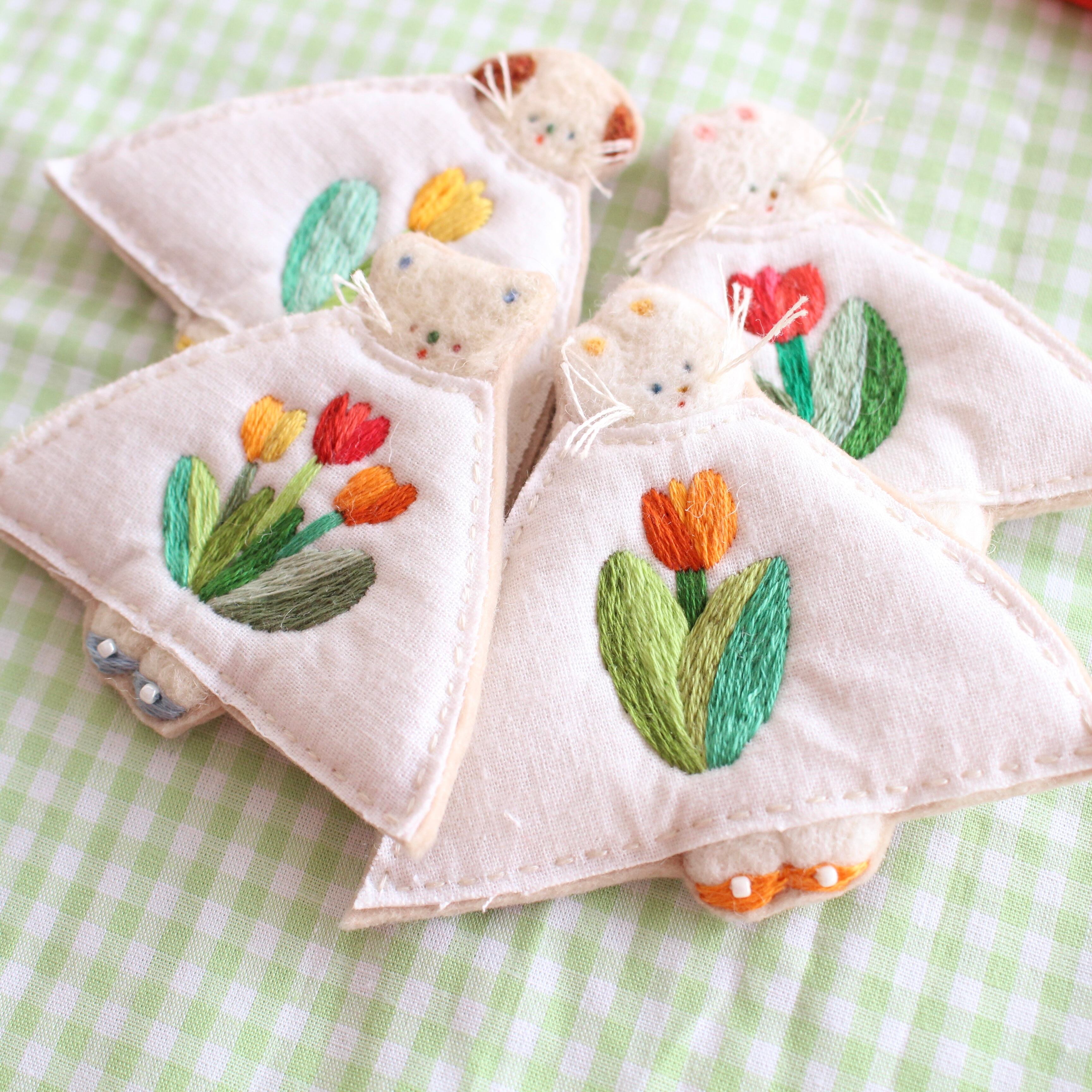 大きなtulipの刺繍をした真っ白いワンピースのわんこのbroochです。