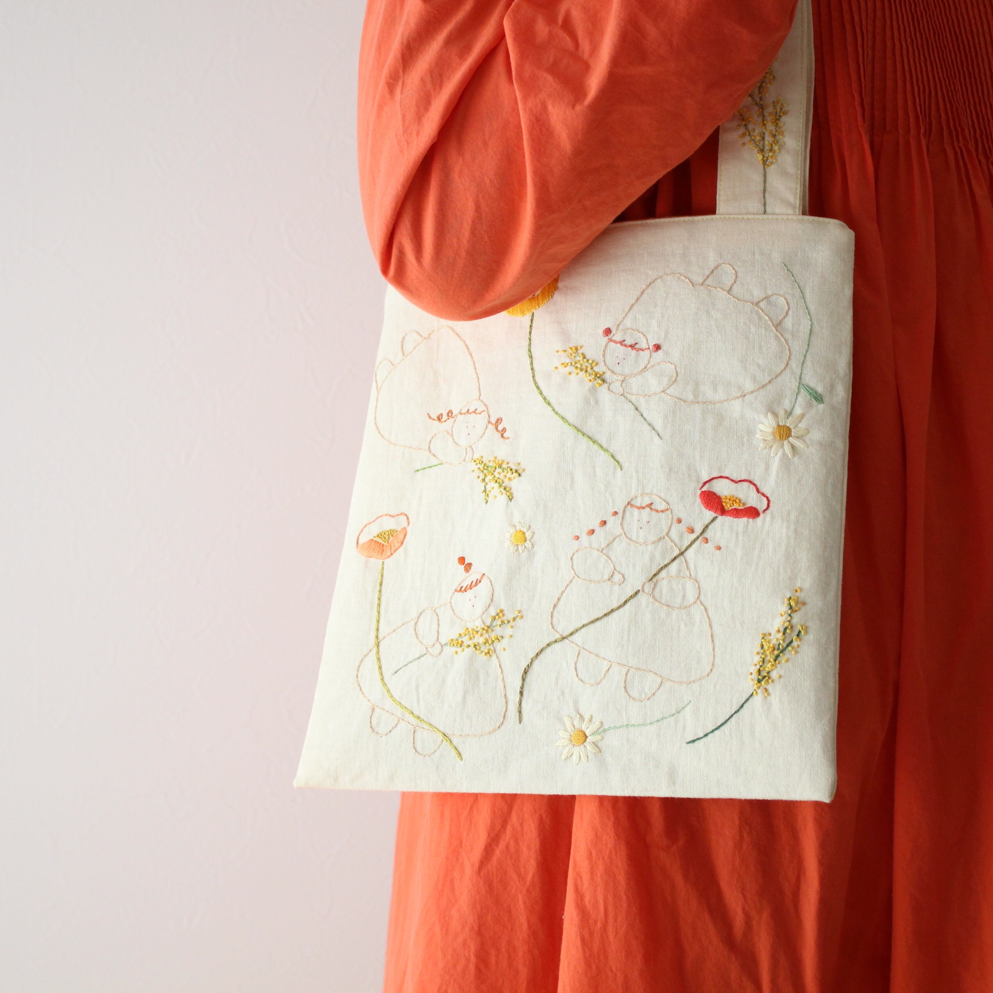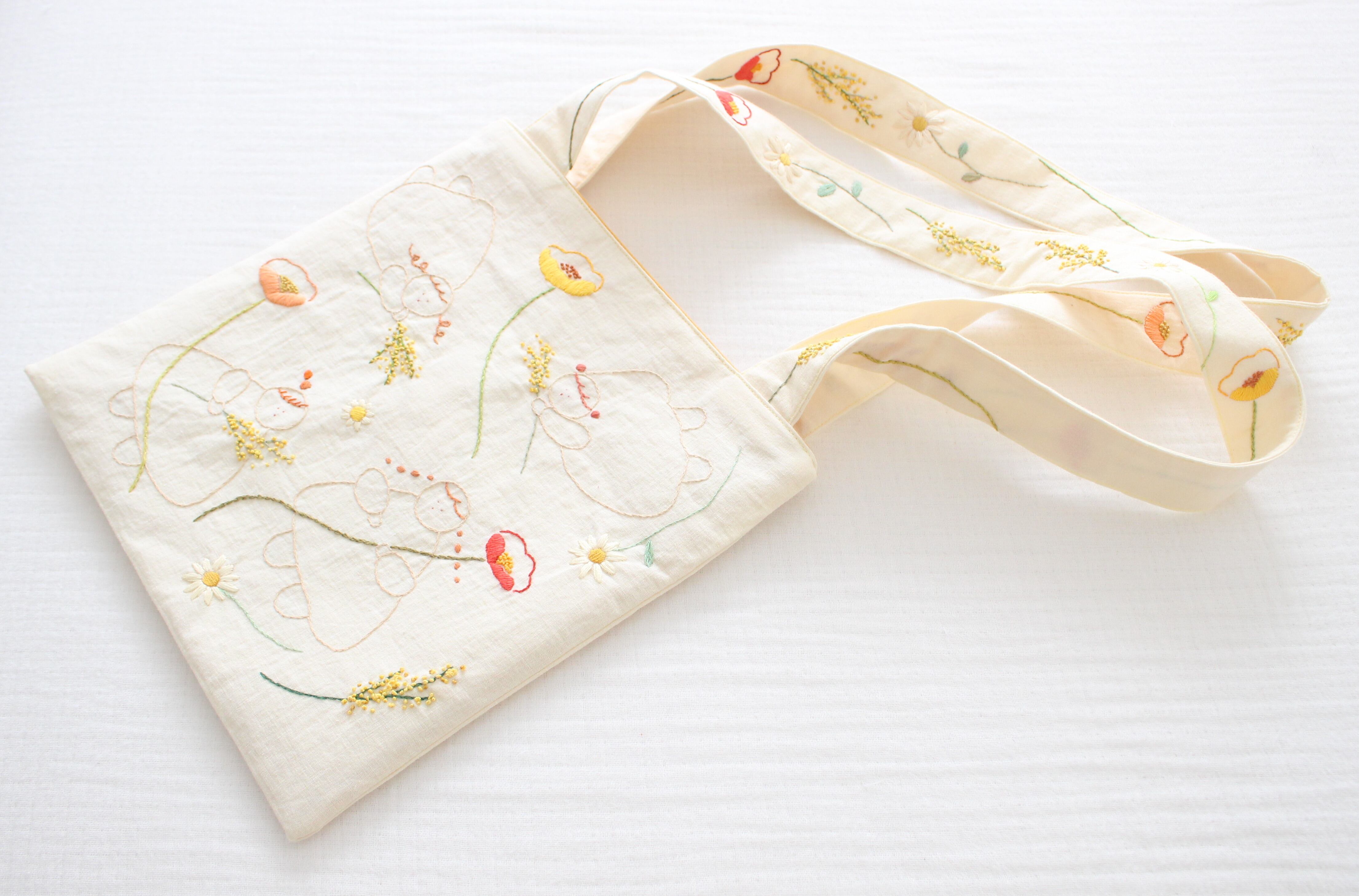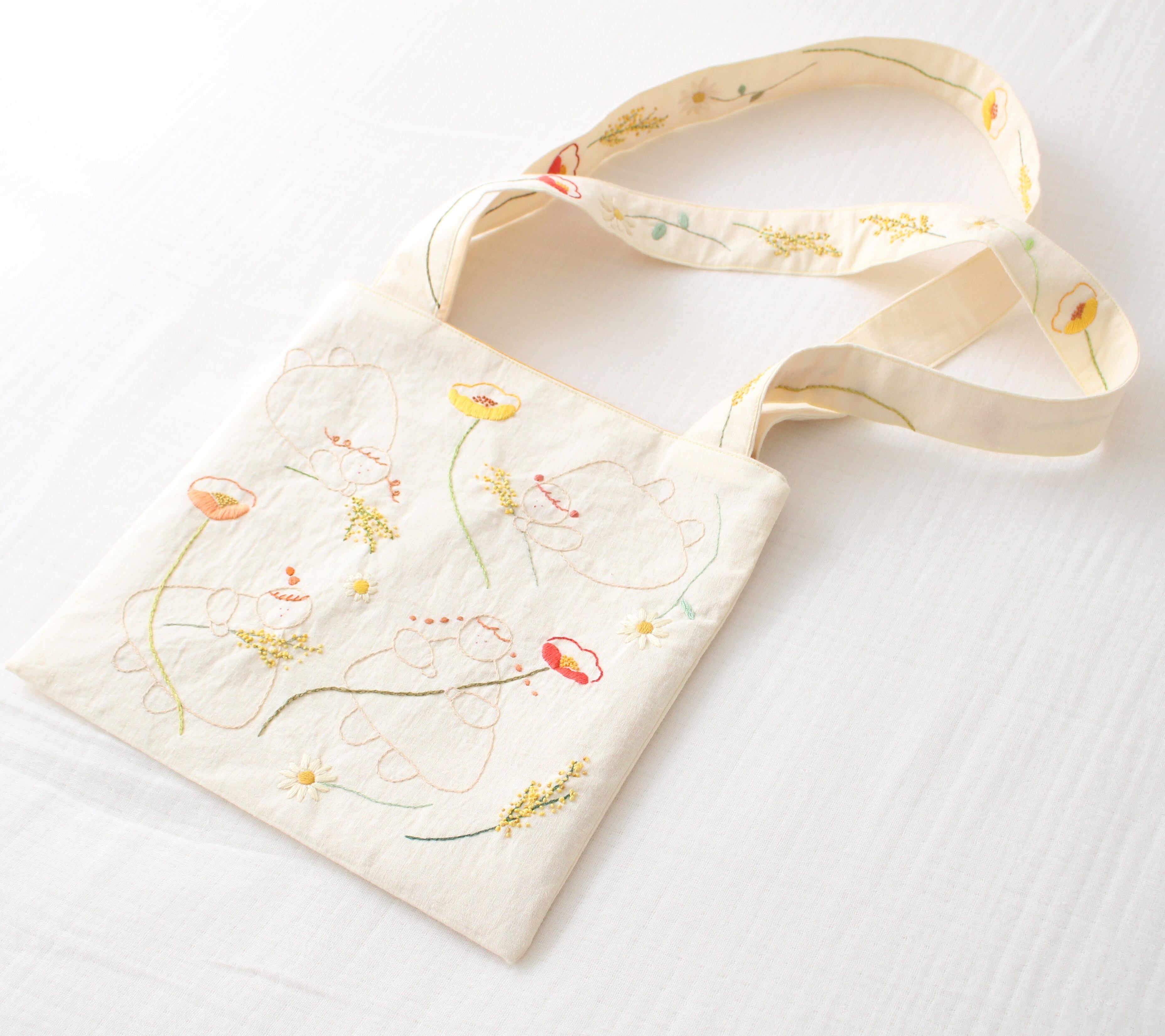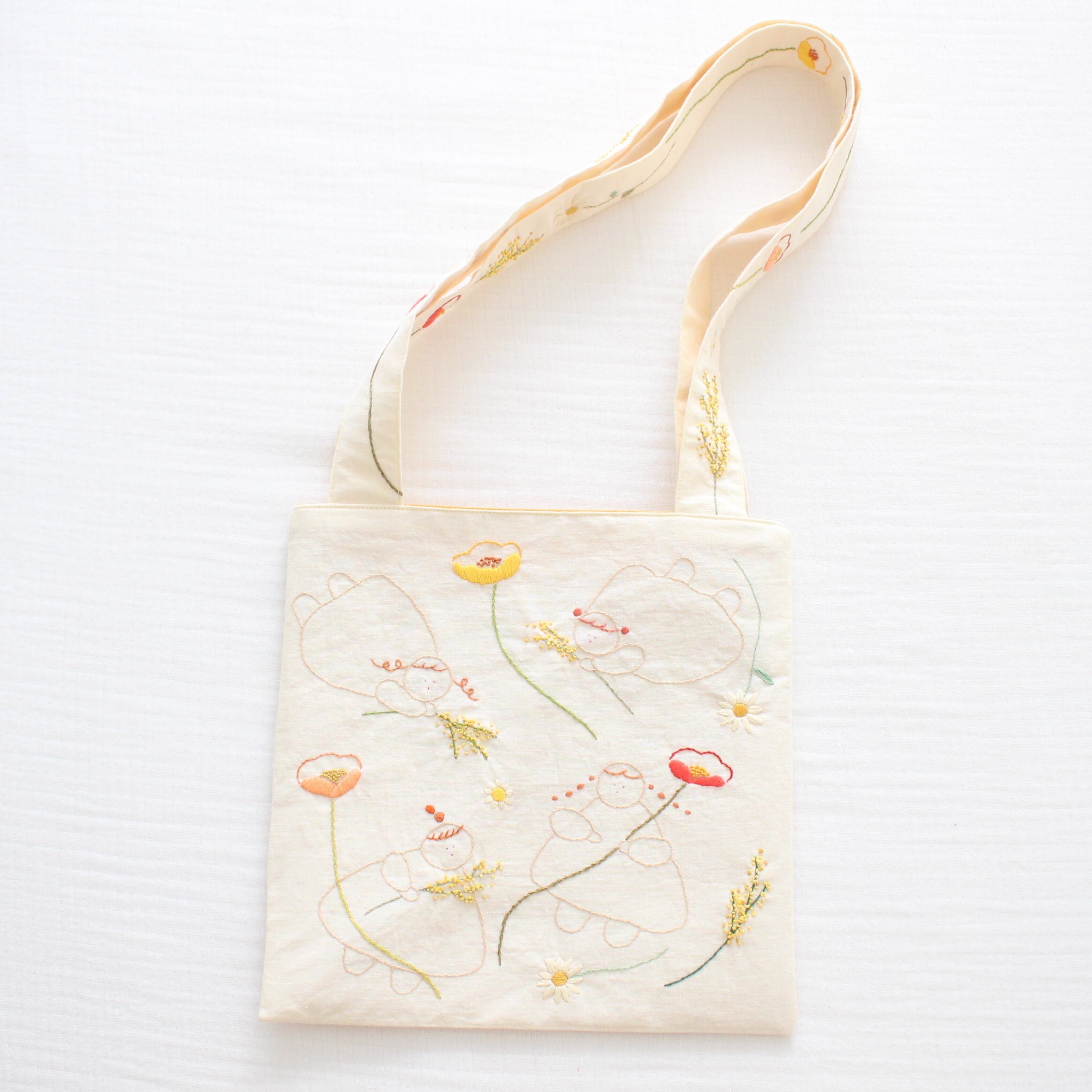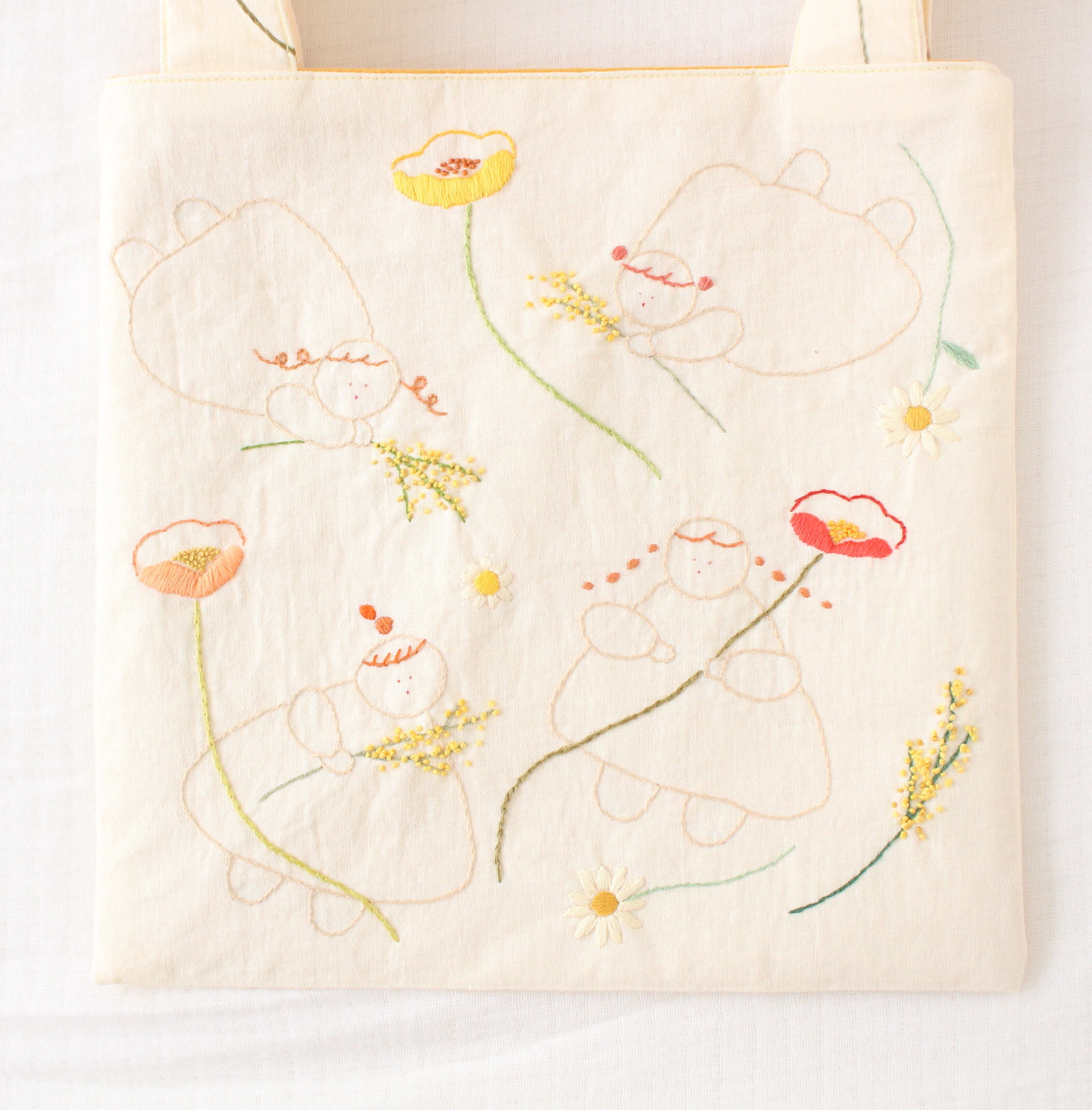 春のお花 mimoza と poppy の妖精ちゃんの刺繍bag です。