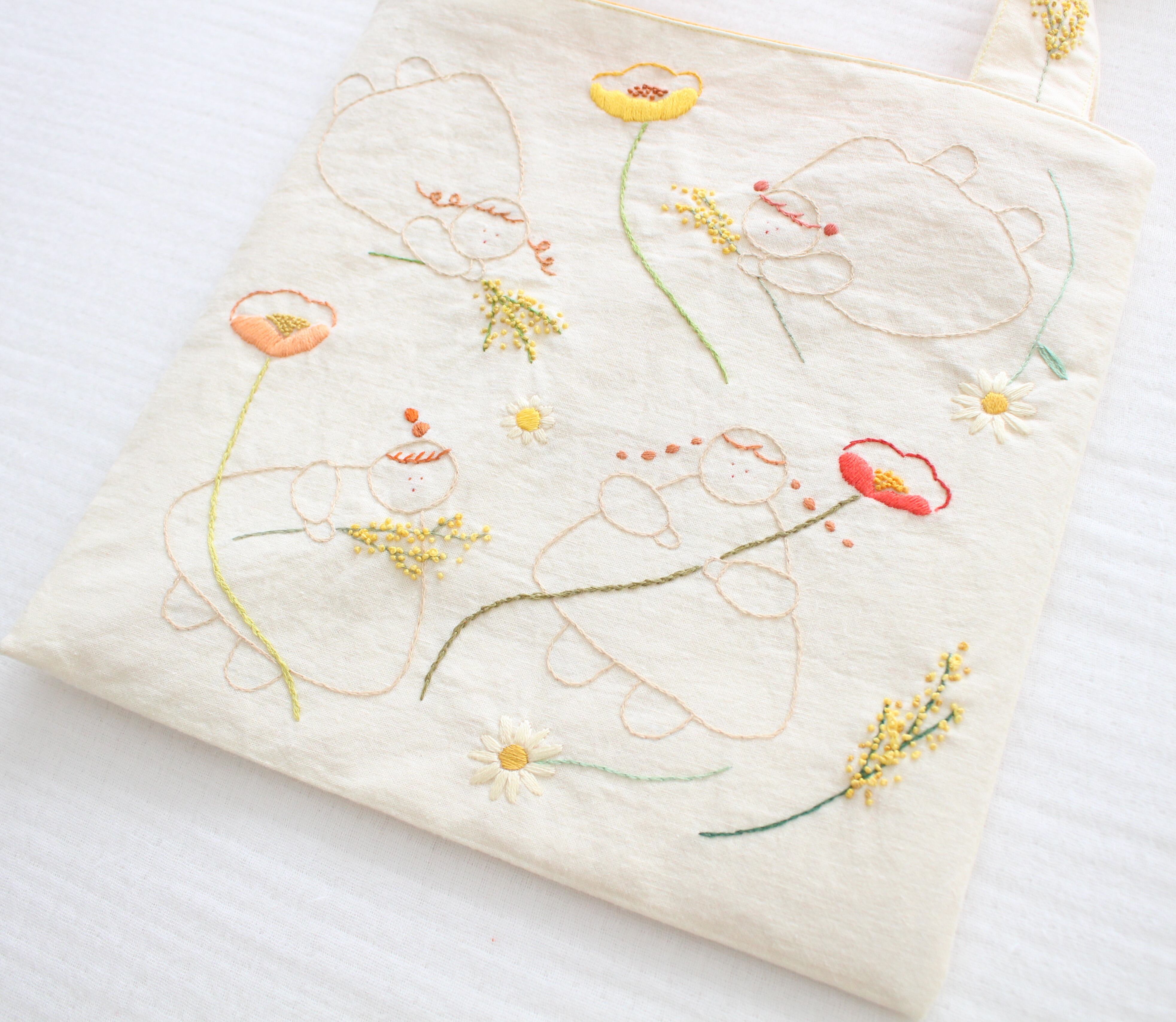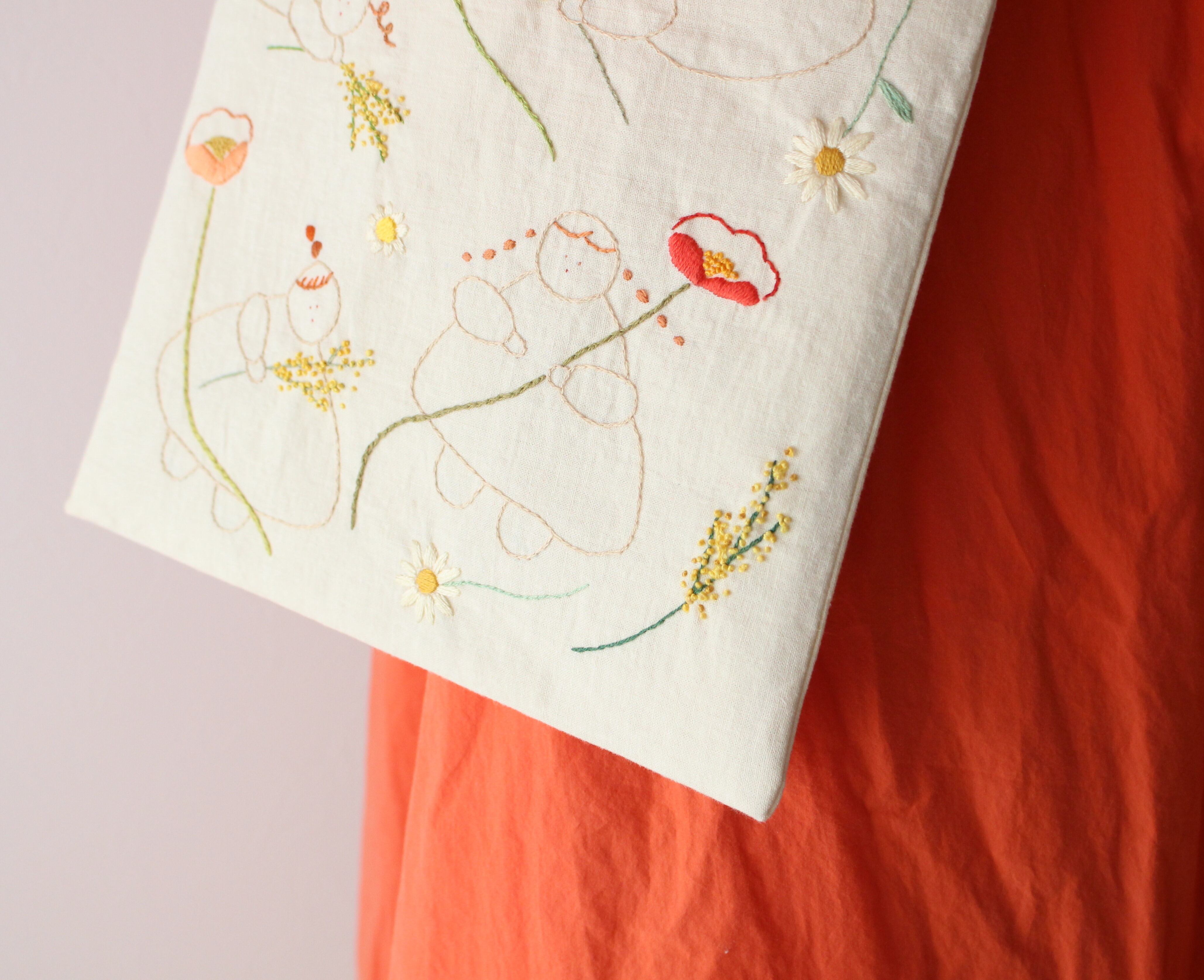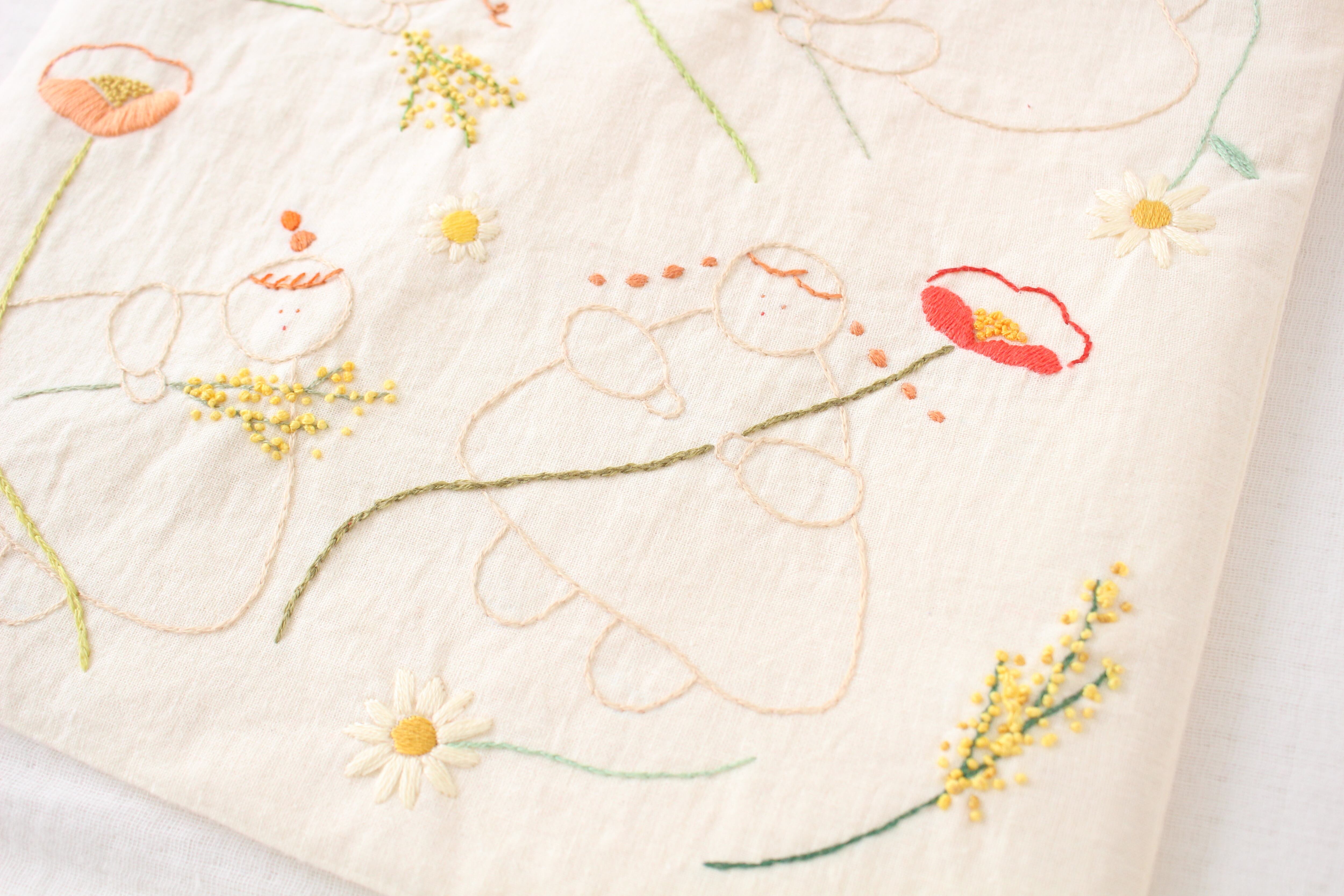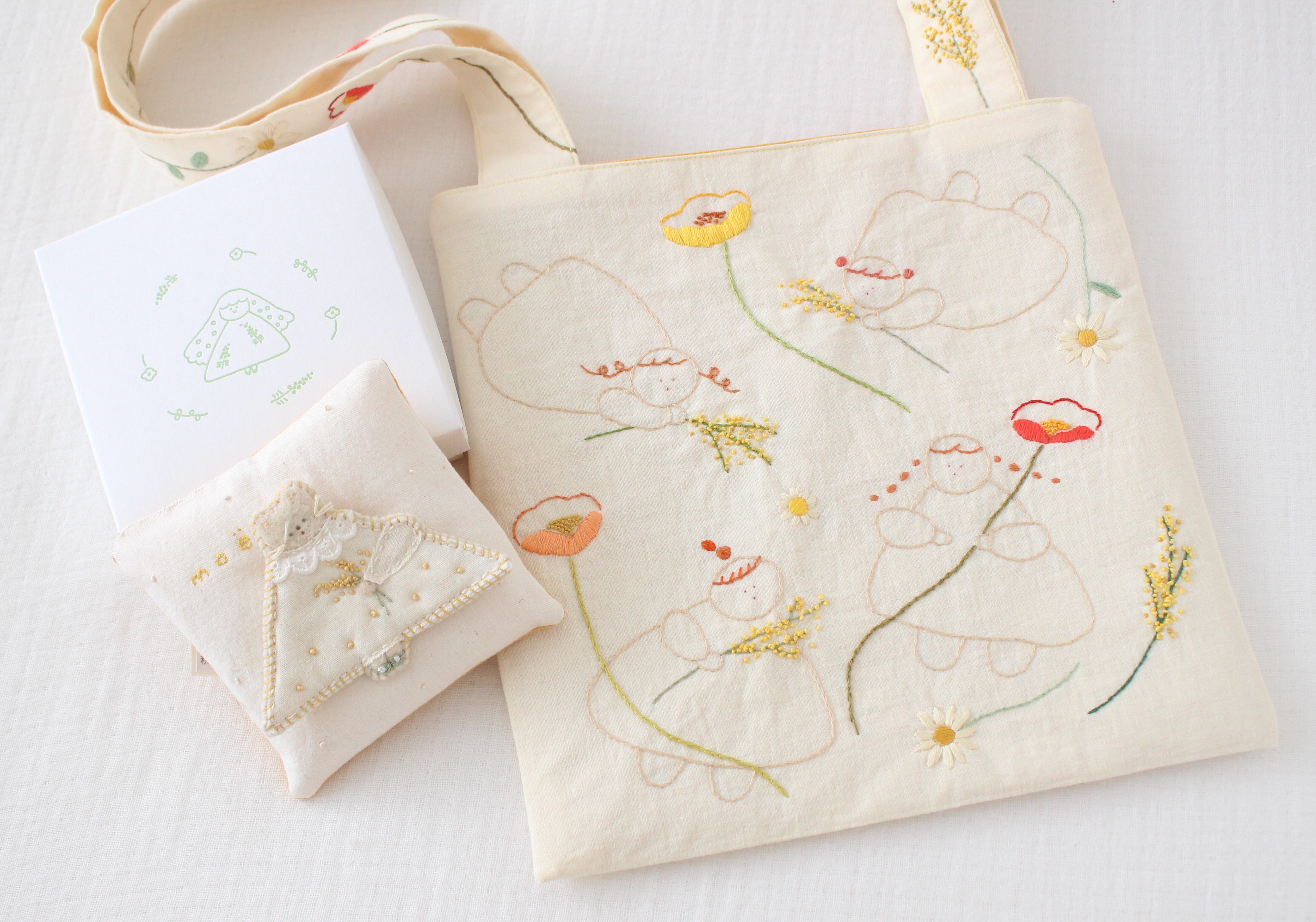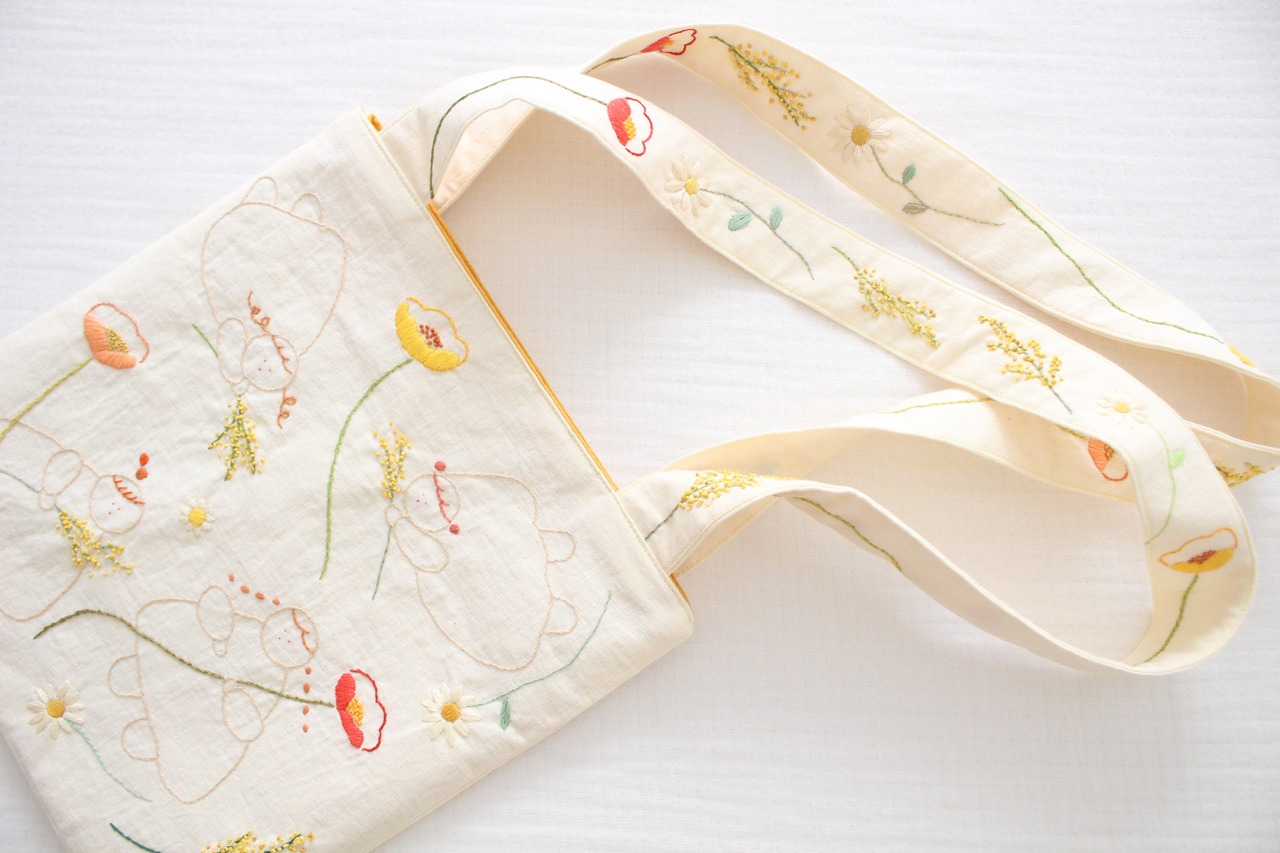 春のお花 mimoza と poppy の妖精ちゃんの刺繍bag です。