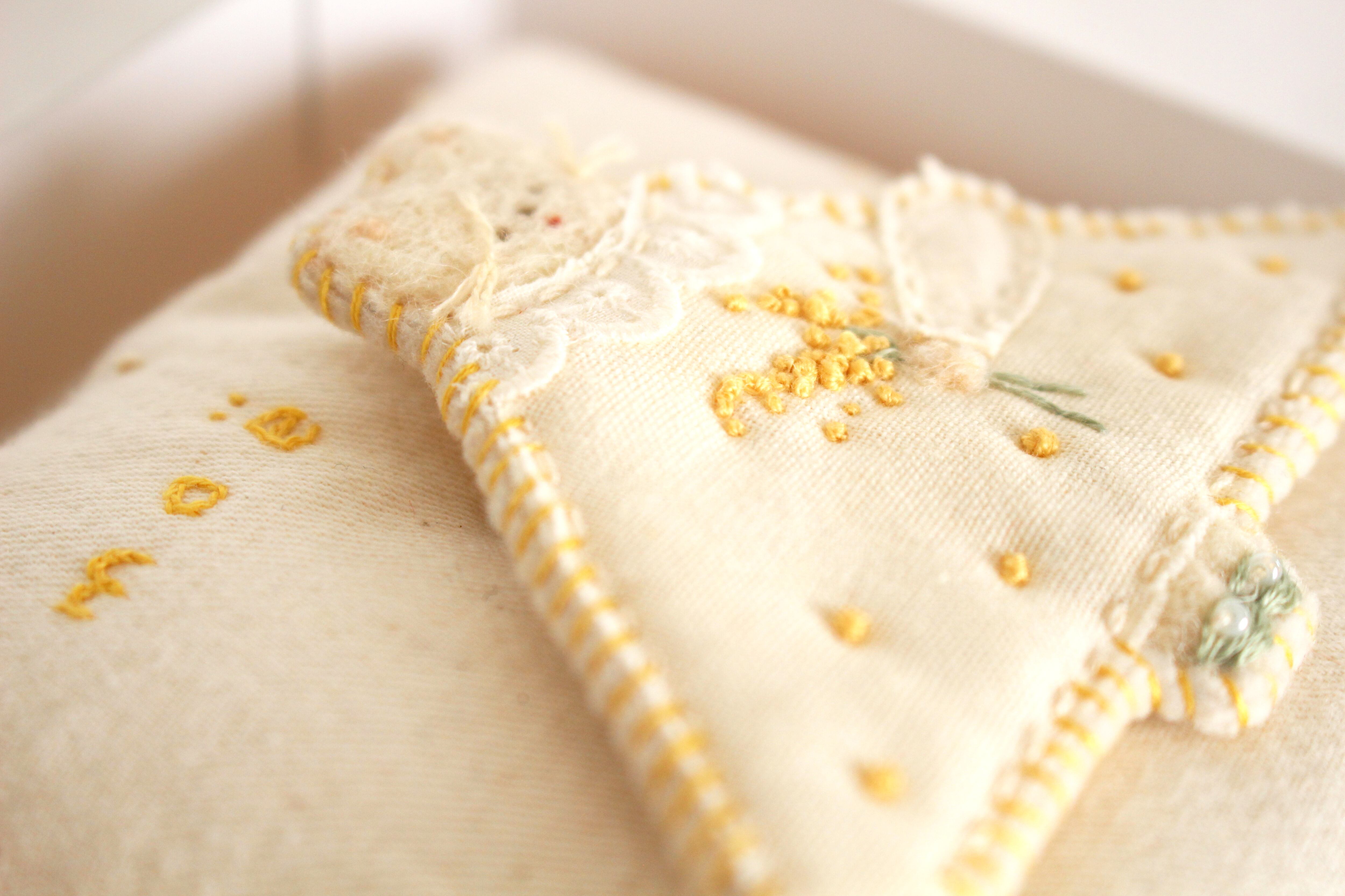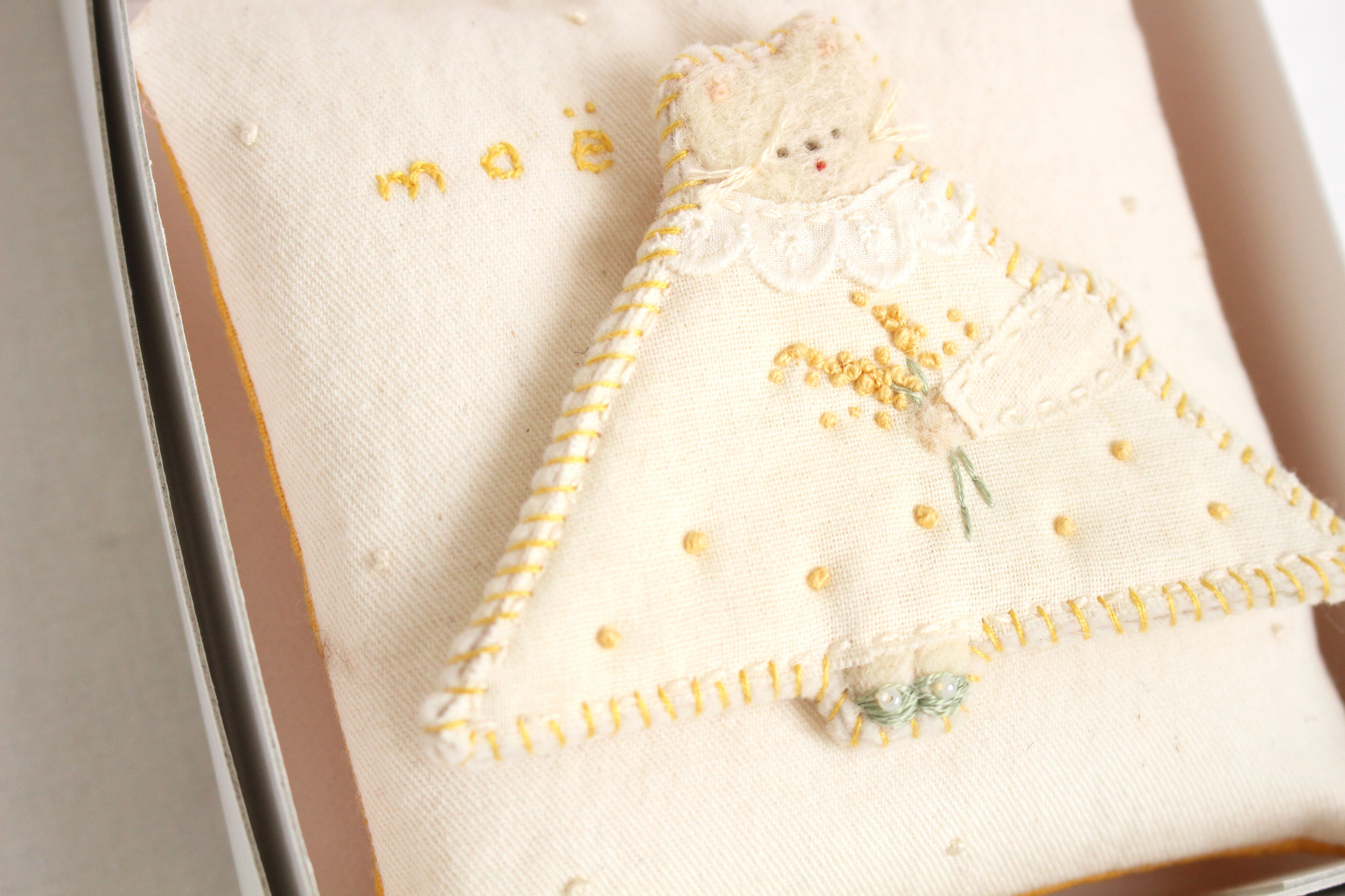 春のお花mimozaと真っ白ねこちゃんのbroochです。