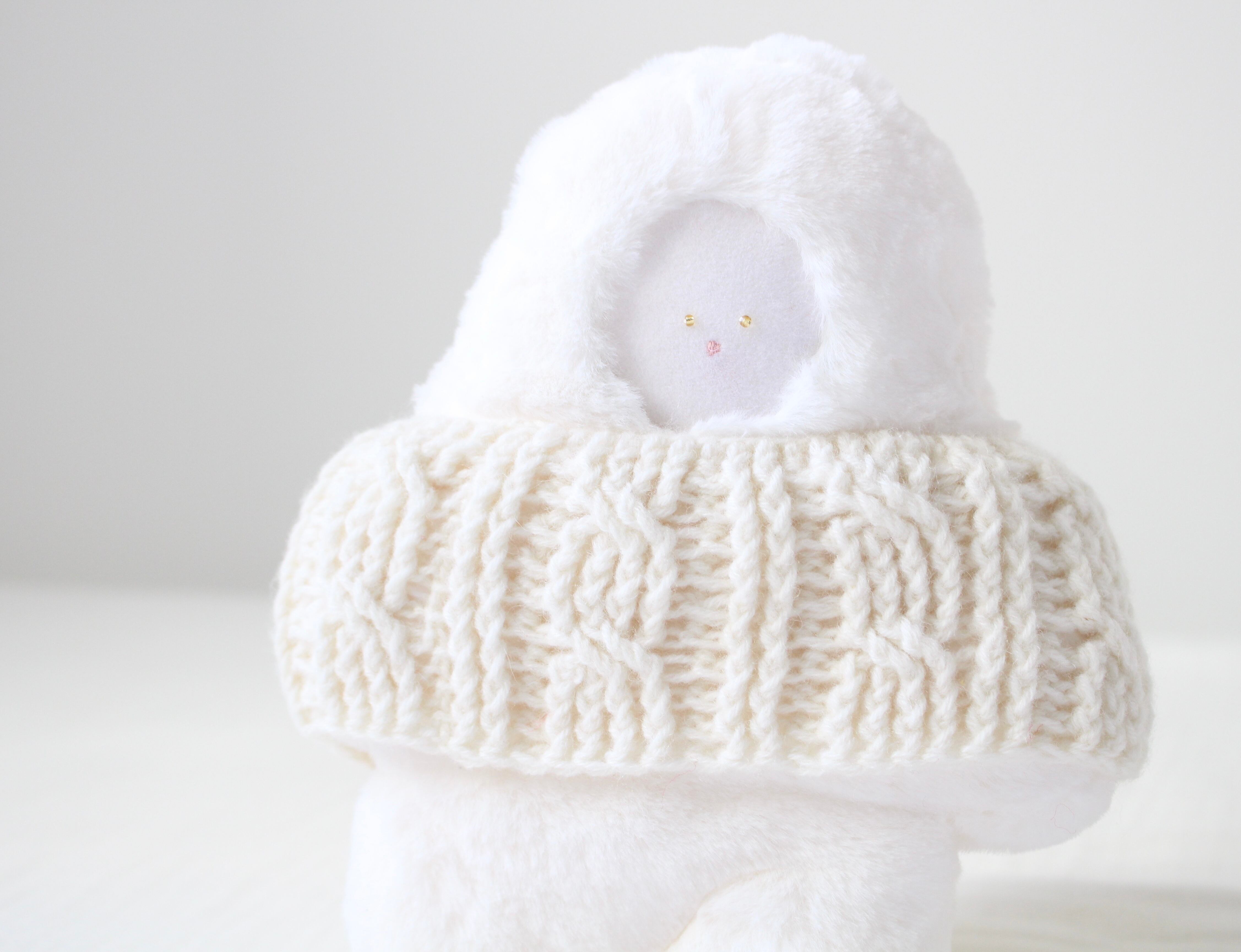 あたたかい白いセーターを着ています。セーターは脱着可能です。